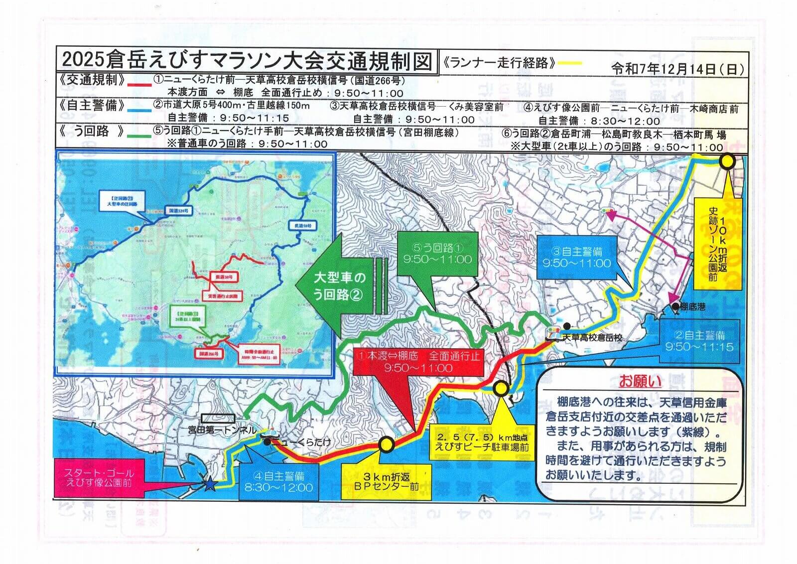 当日倉岳町内で「えびすマラソン」が開催され国道266号線の一部区間が通行止めになるため、チェックアウトの時間を2時間延長させていただきます。